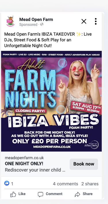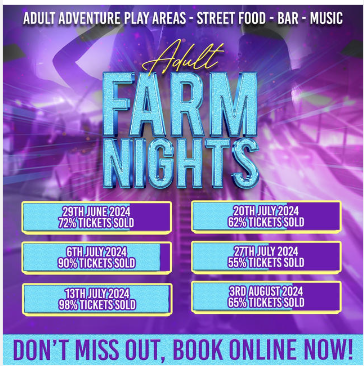 Adult Farm Nights: Capitalised on the unique draw of adult - only experiences, introducing themed events such as an Ibiza - themed night. The success of initial advertisements led to rapid sell - outs, prompting the addition of more dates to accommodate high demand.